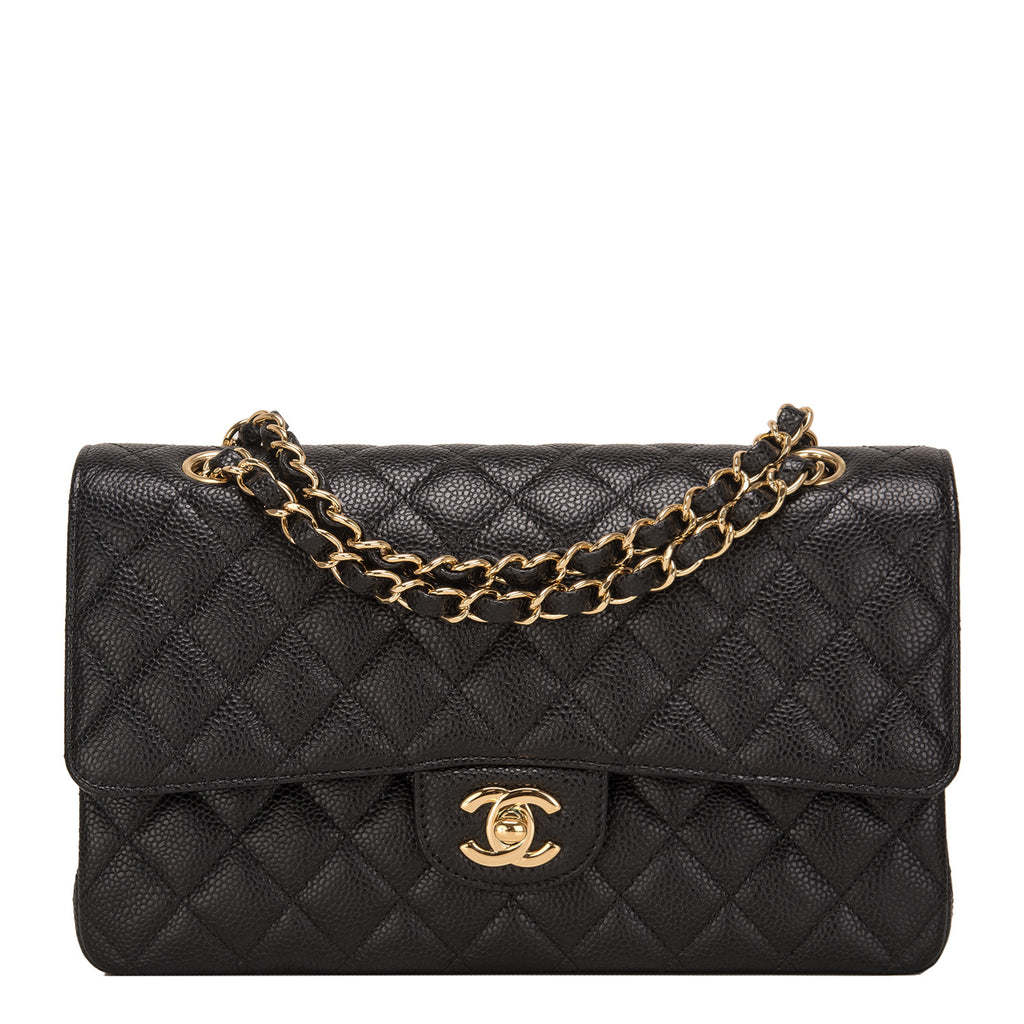 Chanel Medium Classic double flap bag of black quilted caviar leather with gold tone hardware.