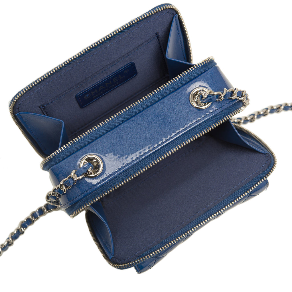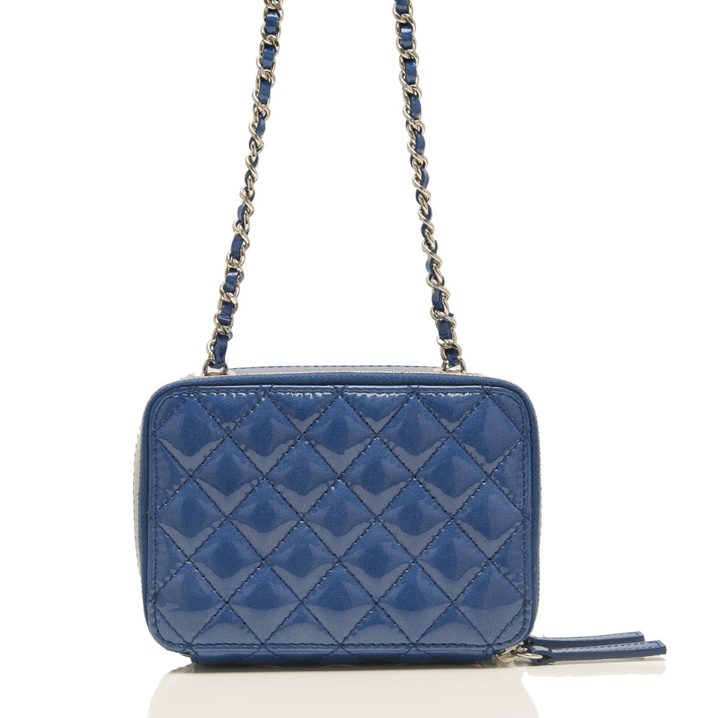 This bag features a front flap quilted pocket with CC charm, two separate compartments -- one in front and one in back -- with zip around closures with matching blue patent and an interwoven silver tone chain link and blue leather shoulder/crossbody strap.