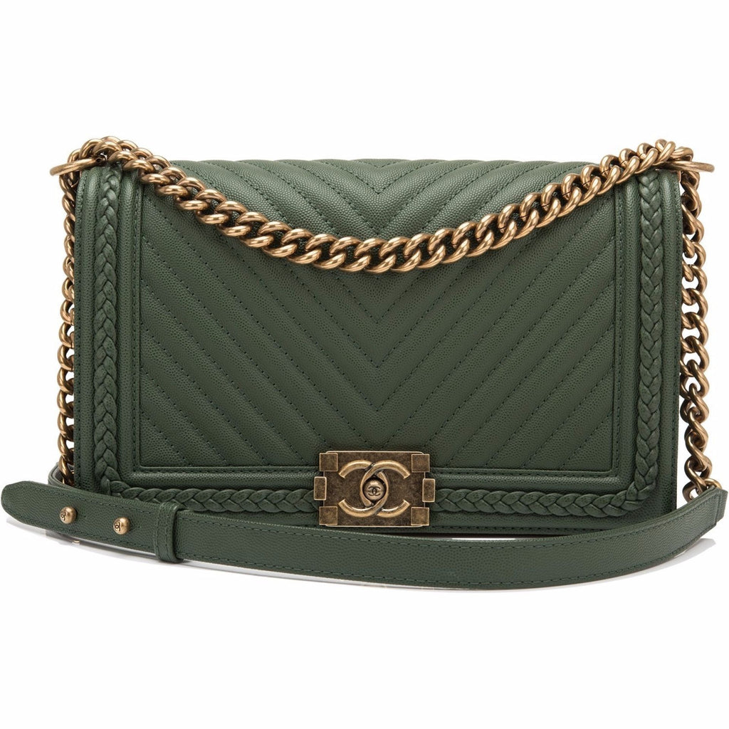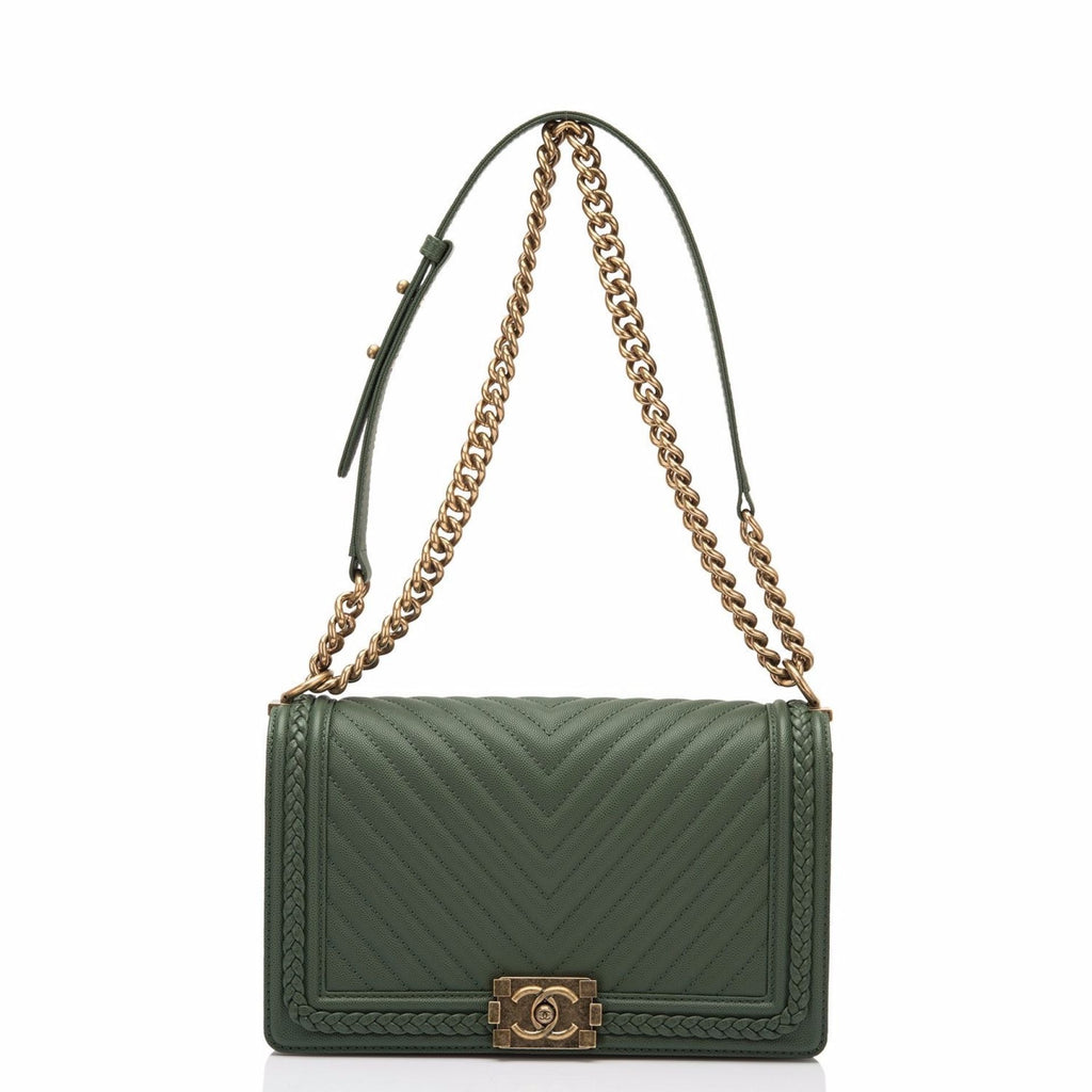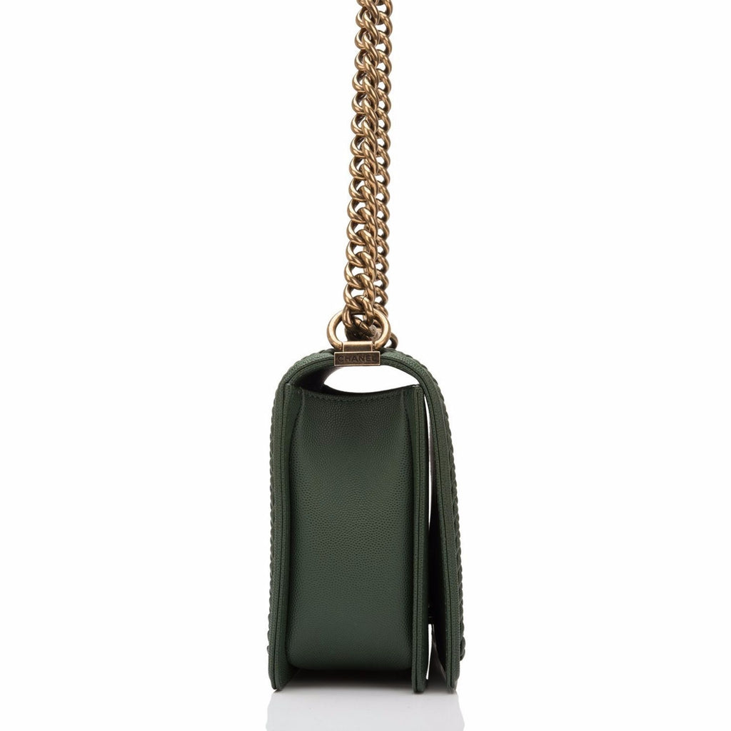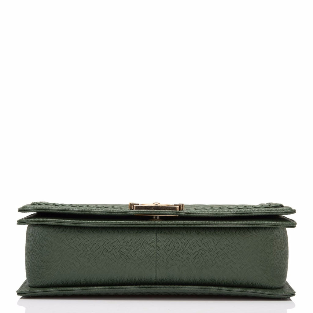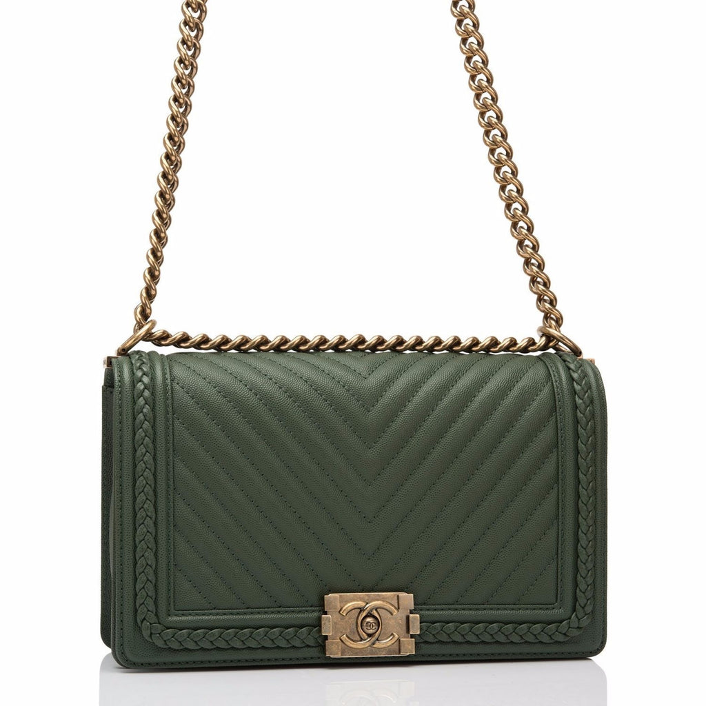 Chanel Green Braid Around Chevron Quilted Caviar New Medium Boy Bag
