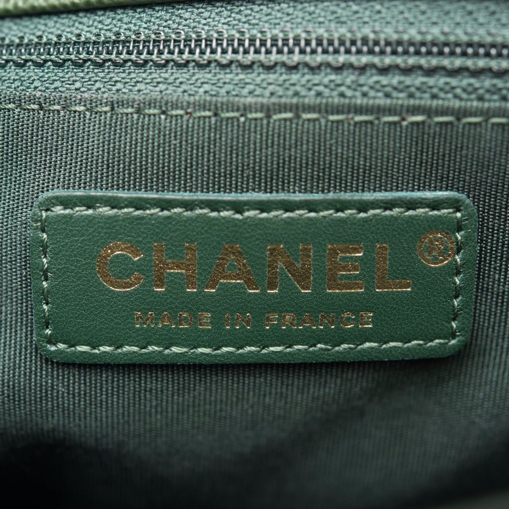 The interior is lined in green fabric with a slit pocket on the front wall and a zipper pocket with a Chanel pull on the rear wall.