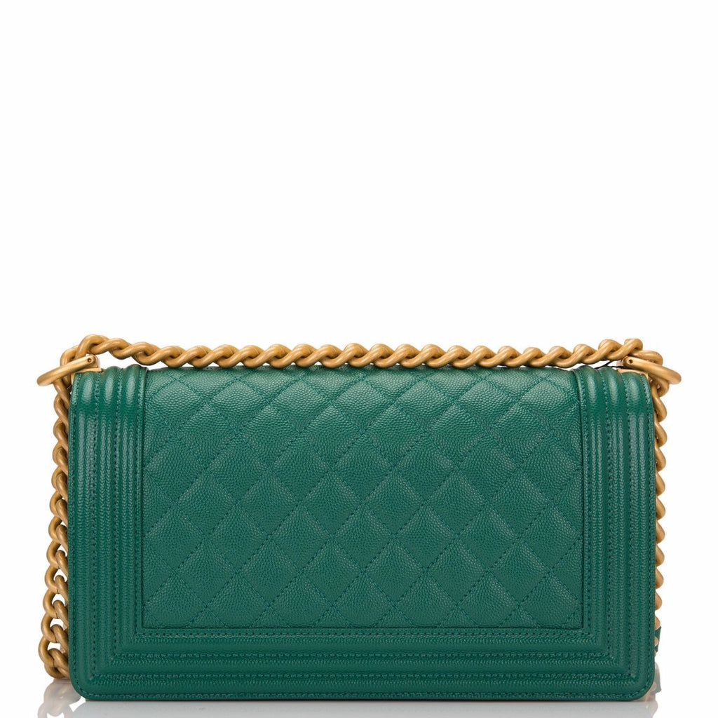 Chanel Old Medium Boy bag of green quilted caviar leather with antique gold tone hardware.