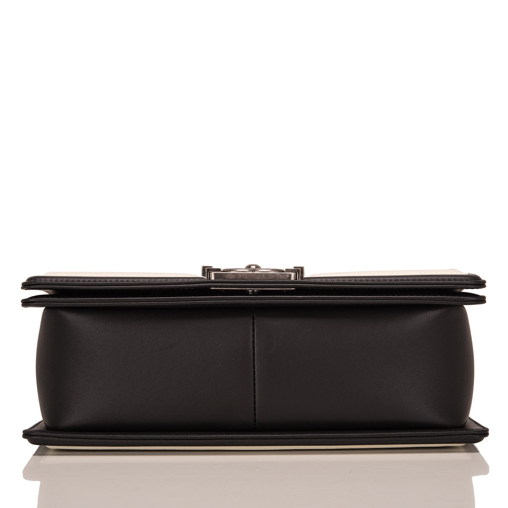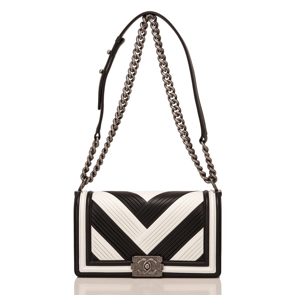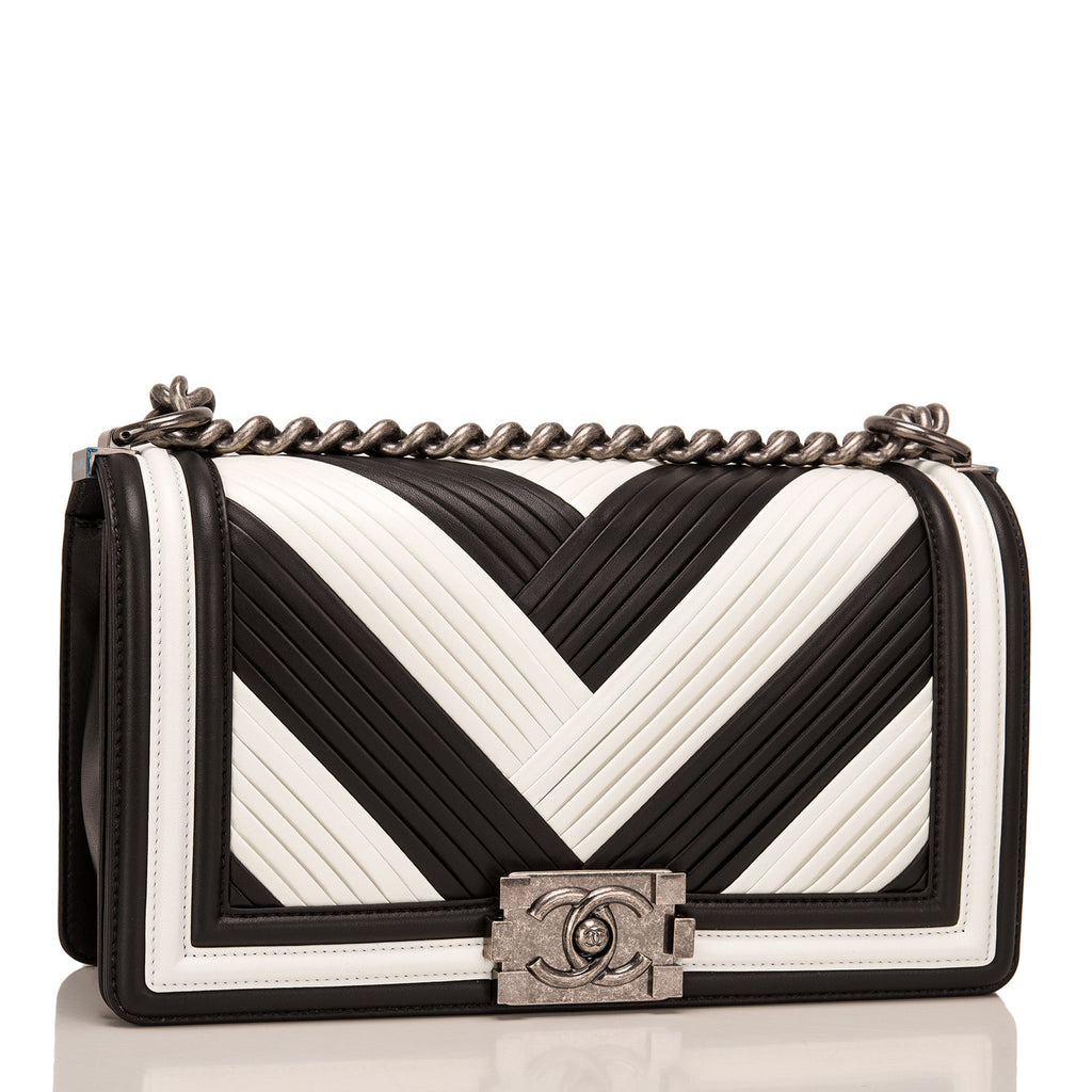 Chanel Paris In Rome Metiers d'Art Medium Boy bag of black and white pleated calfskin with ruthenium hardware.