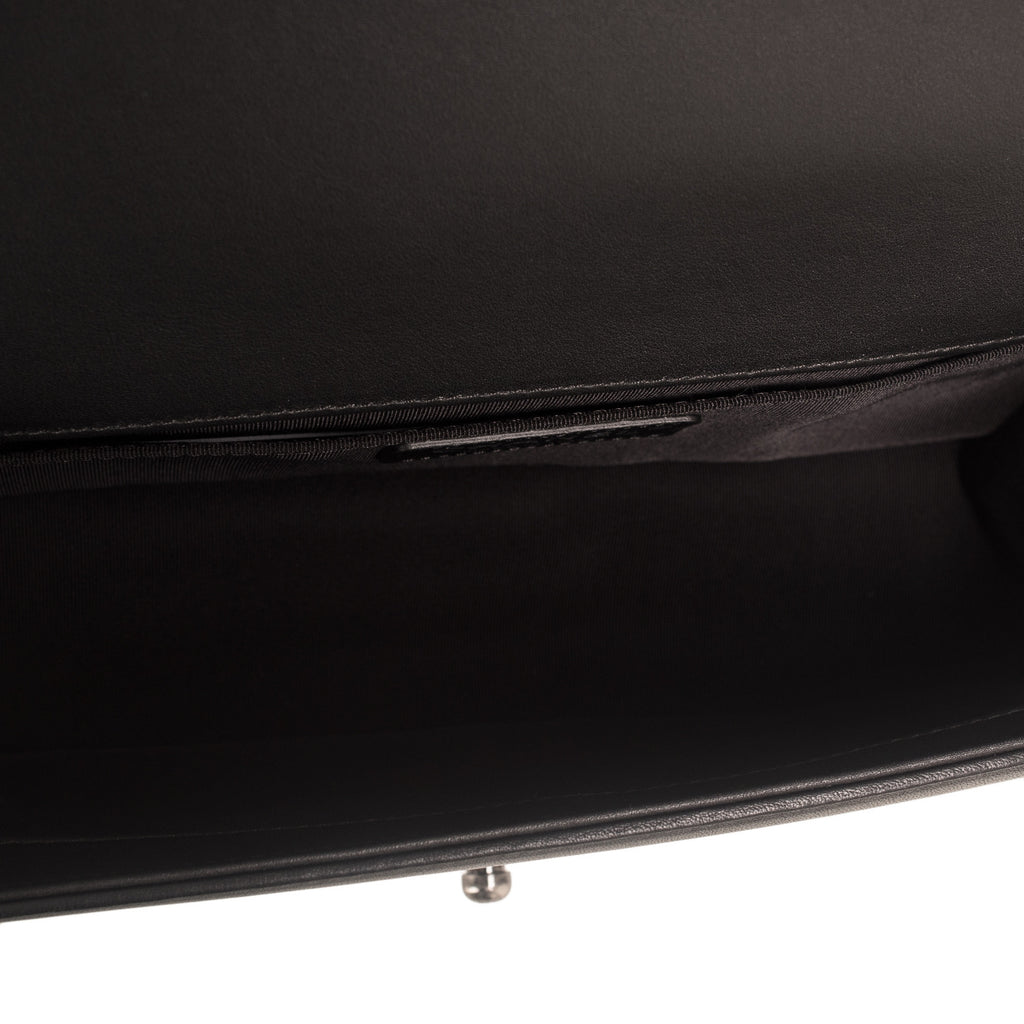This limited edition Chanel bag is in the classic Boy style with a full front flap with the Boy signature CC push lock closure detail and ruthenium chain link and black leather padded shoulder/crossbody strap.