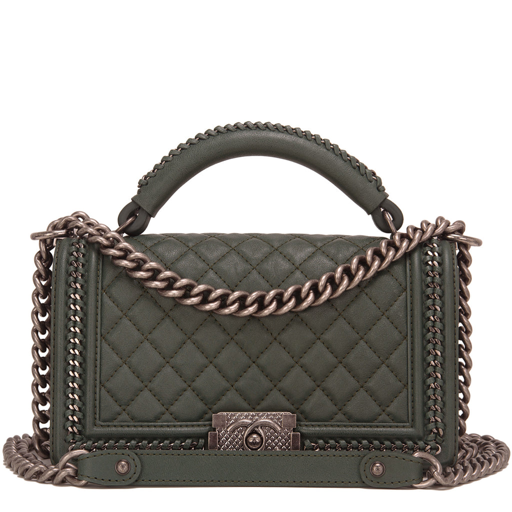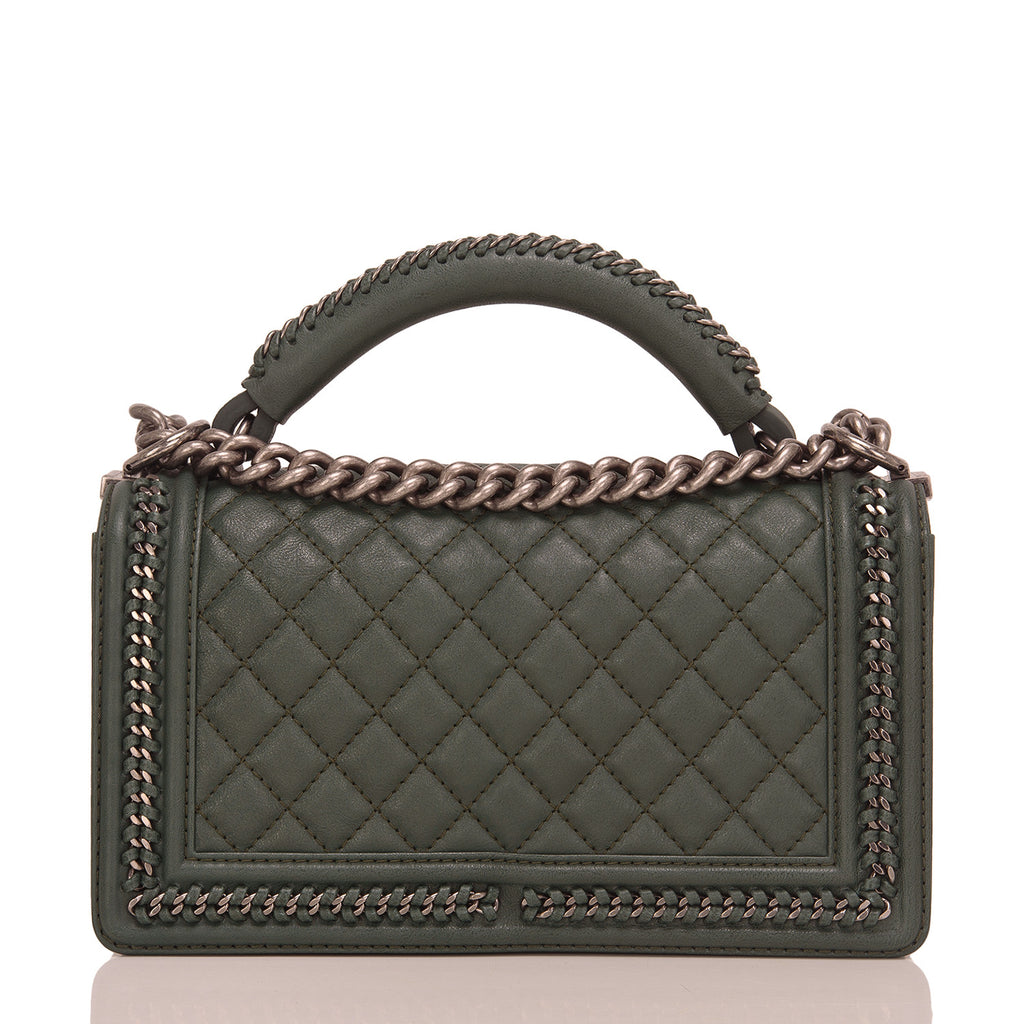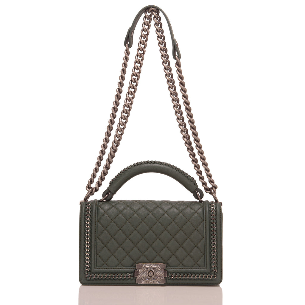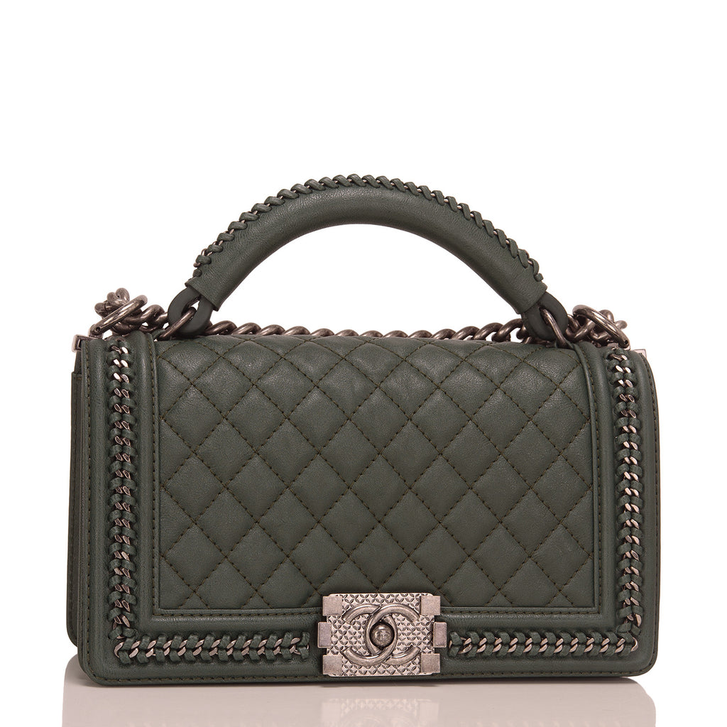 This limited edition bag features a braided leather and chain top handle, a full front flap with etched Boy CC push lock closure, a chain stitch lined with ruthenium hardware edging the front and back, and a ruthenium chain link and dark green leather padded shoulder/crossbody strap.