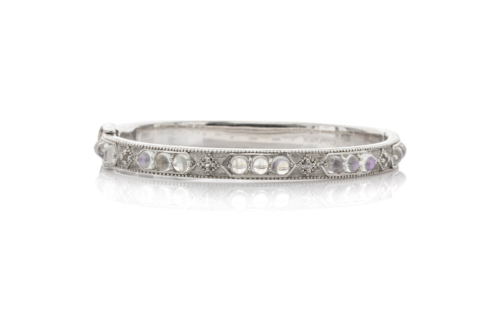 Sterling silver moonstone and white topaz Lisse bangle bracelet, by Jude Frances.
