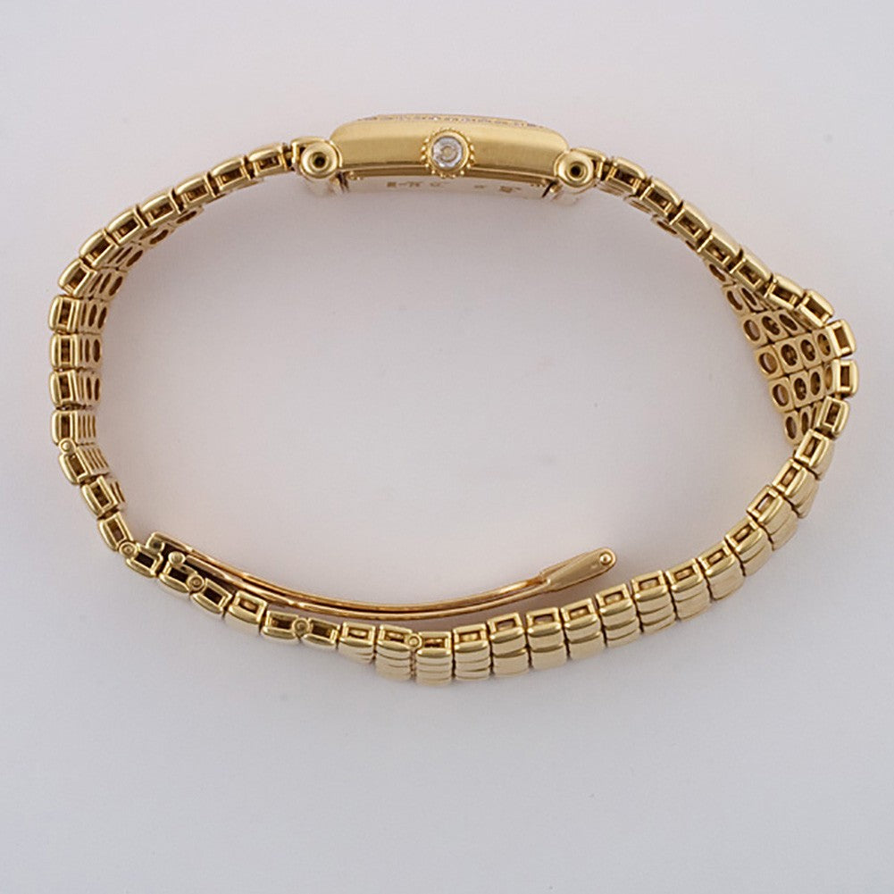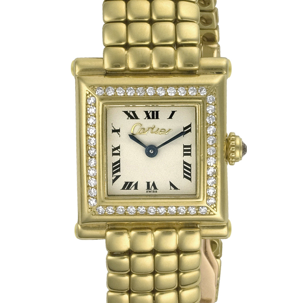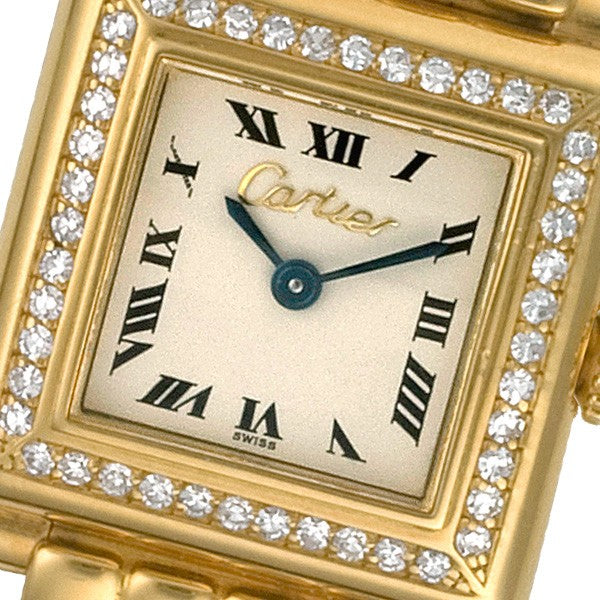 Ladies Limited Edition Cartier Trocadero in 18k yellow gold with diamond crown and diamond bezel on a snake band. Quartz. Fine Pre-owned Cartier Watch.
