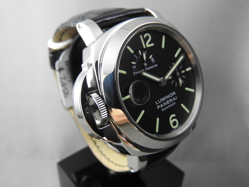 Men's Panerai Luminor Power Reserve Pam 123 in stainless steel. Matte black dial with luminous batons and Arabic numerals with sub-seconds dial at 9 and date at 3 and power reserve at 11. Chronometer rated automatic mechanical calibre OP IX movement with 40hrs power reserve. 44mm case with domed sapphire crystal and trademark stirrup crown guard. Crocodile original Panerai branded strap with steel deployment buckle.