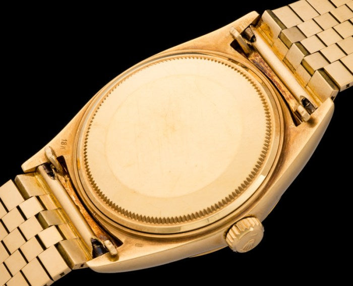 Outstanding glittering yellow gold Rolex Day-Date ref 1806. Exceptionally rare monochrome yellow dial showcasing gold relief applied Arabic script numerals, and Arabic date and day wheel. The case, the bezel and the wonderful bracelet are decorated with a linen-textured pattern. This 1806 was retailed in Oman in 1972 with serial number 2.971xxx. A very similar example is published on Pucci Papaleo Day-date "The Presidential Rolex".